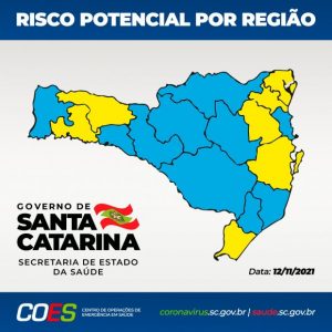 Pela sexta semana consecutiva, nenhuma região do estado foi classificada nos níveis de risco grave (laranja) ou gravíssimo (vermelho). A Matriz de Risco Potencial Regionalizado divulgada neste sábado, 13, aponta 10 regiões como risco potencial moderado (cor azul) e sete regiões alto (cor amarela). Houve melhora nos indicadores das regiões