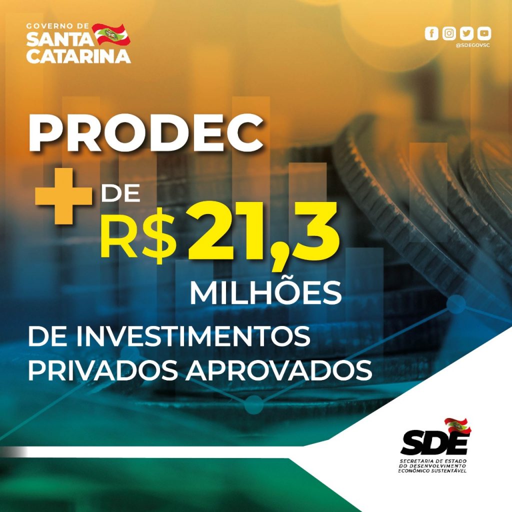 Com uma previsão de cerca de R$ 21,3 milhões em investimentos privados no estado e criação de mais de 260 empregos, a Secretaria de Estado do Desenvolvimento Econômico Sustentável aprovou a implantação de três empresas no Oeste. Os valores foram autorizados durante reunião realizada nesta quarta-feira, 8, pelos representantes do conselho deliberativo do Programa de Desenvolvimento da Empresa Catarinense (Prodec), que é coordenado pela Diretoria de Empreendedorismo e Competitividade da SDE.