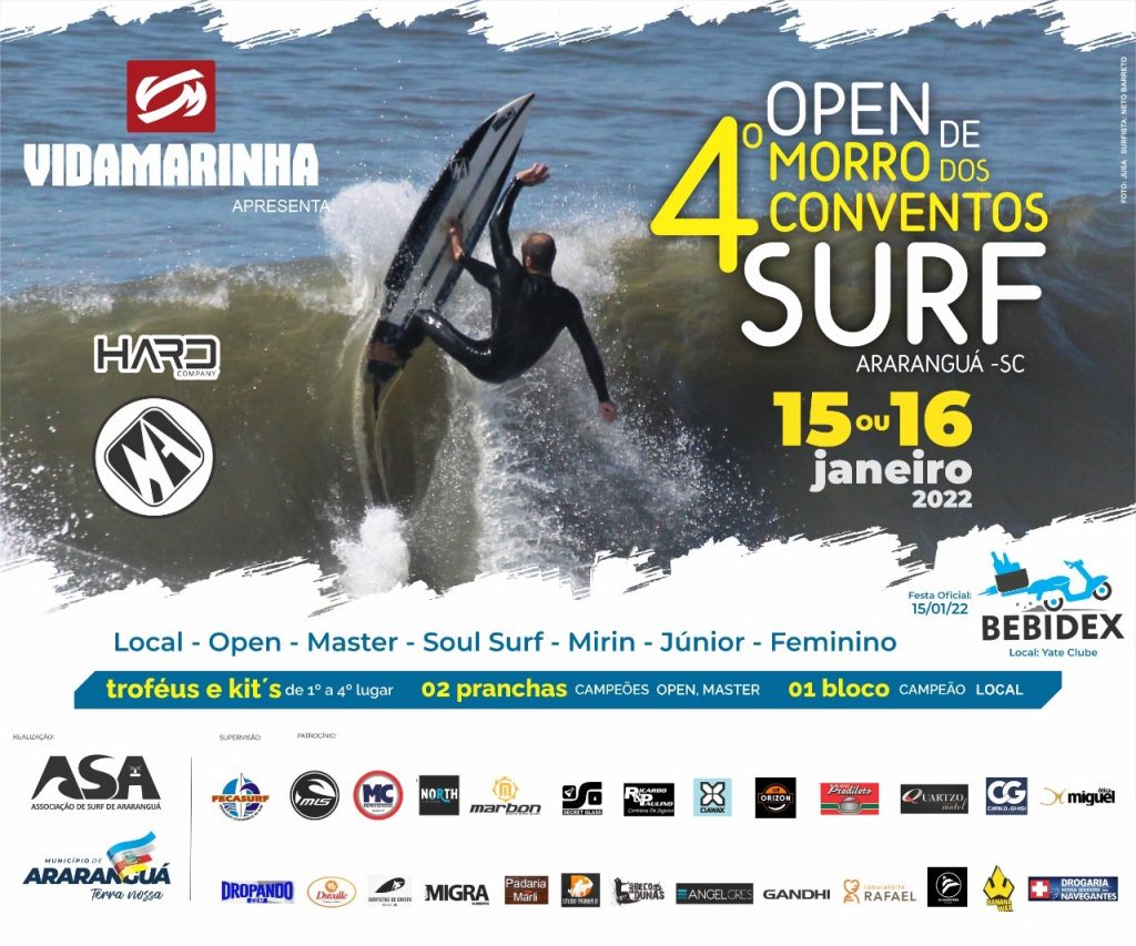 Está marcada para os dias 15 e 16 de janeiro a 4° edição do Morro dos Conventos Open Surf, campeonato apresentando pela loja Vida Marinha, com realização da Associação de Surf de Araranguá (ASA). A competição terá o apoio da Administração Municipal de Araranguá, através do Departamento de Esportes.