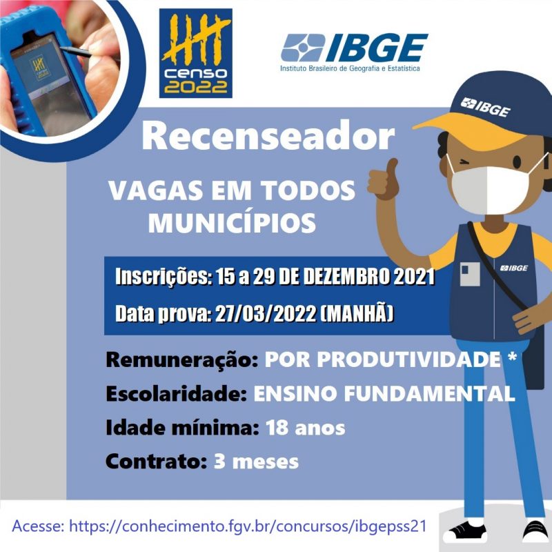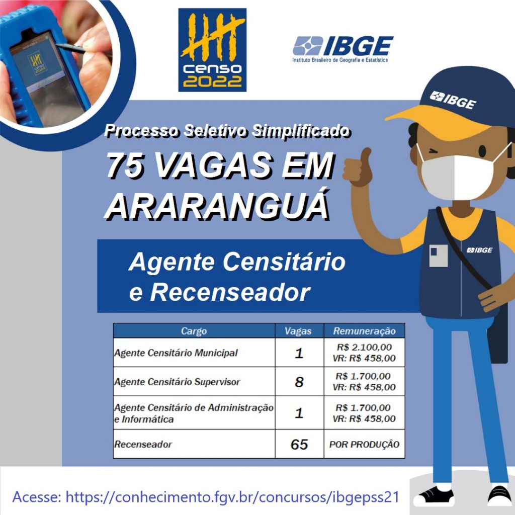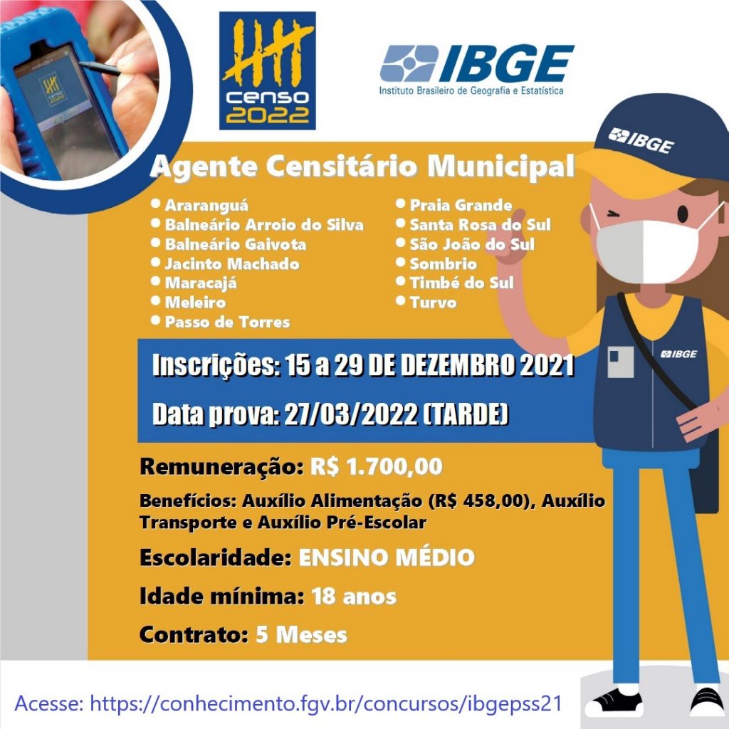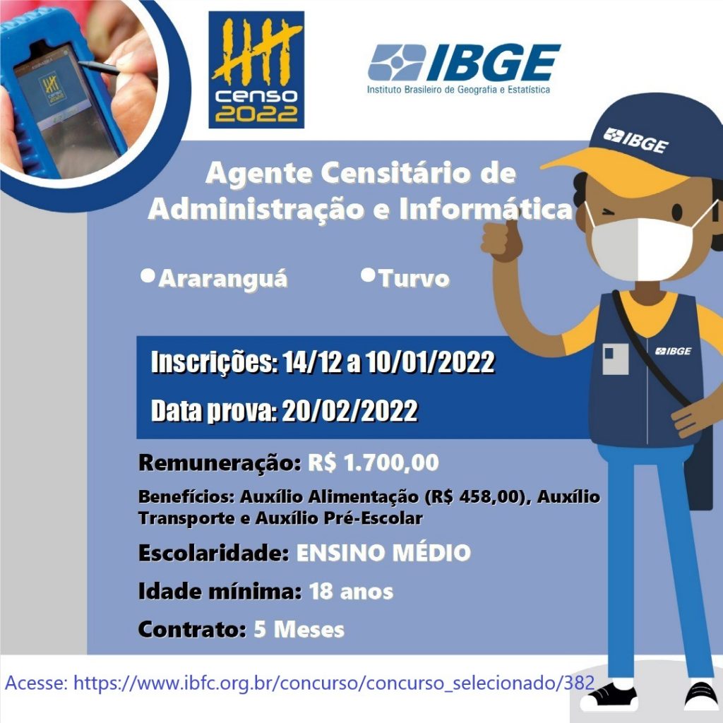 Outro processo seletivo, este aberto dia 14/12/2021, contratará o agente censitário de administração e informática (ACAI), com 72 vagas em 49 municípios de Santa Catarina. O processo seletivo de ACAI será realizado pelo Instituto Brasileiro de Formação e Capacitação (IBFC). As inscrições são feitas no site do instituto.