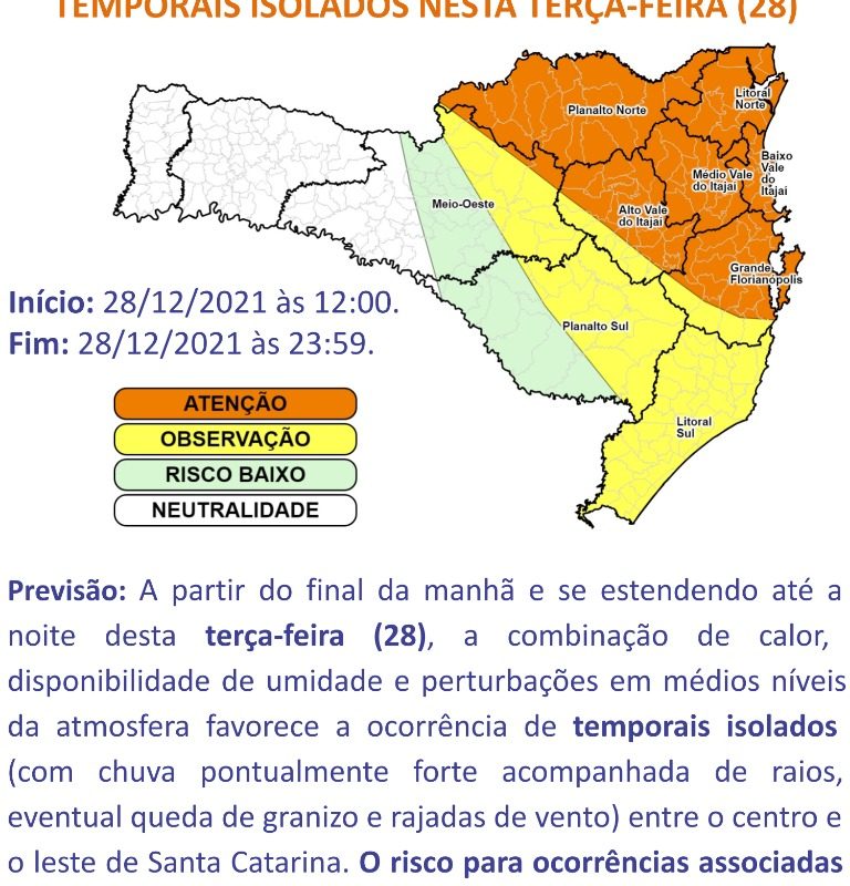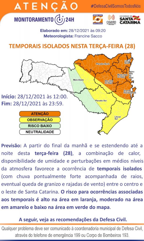 A Defesa Civil emitiu um alerta para temporais isolados nas regiões litorâneas do estado nesta terça-feira, dia 28. Conforme o órgão, as condições ocorrem entre o fim da manhã e a noite desta terça-feira, geradas pelo calor, umidade concentrada e perturbação em médios níveis da atmosfera. Podem ocorrer chuvas pontuais com raios, eventuais quedas de granizo e rajadas de vento entre o centro e o leste de Santa Catarina.