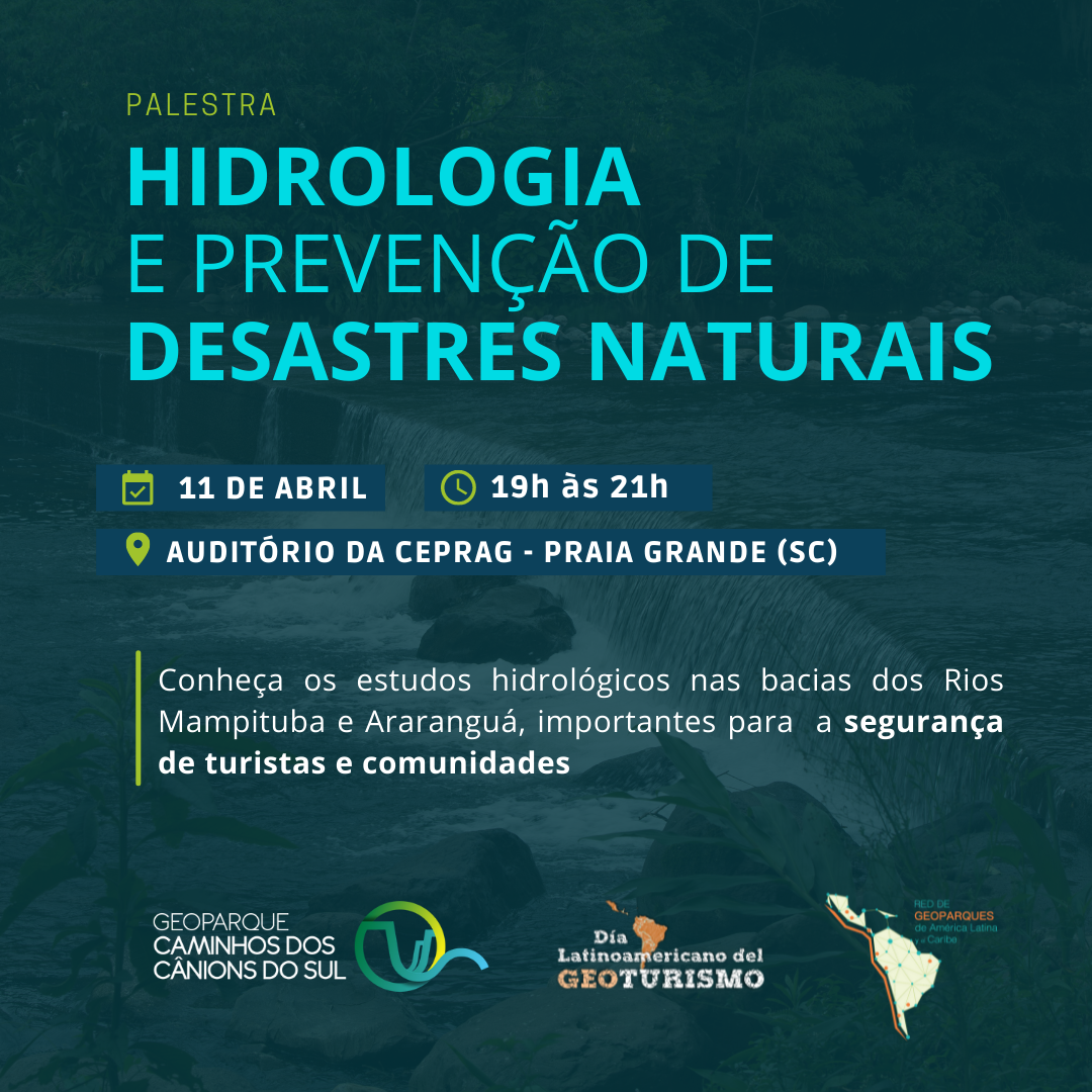 O Geoparque Caminhos dos Cânions do Sul promove palestra importante para a segurança das comunidades do território e de especial interesse para profissionais que trabalham com turismo. “Hidrologia e prevenção de desastres naturais” é o tema da palestra que será ministrada por especialistas que desenvolvem estudos nas bacias dos Rios Mampituba e Araranguá. O evento acontece no dia 11 de abril, a partir das 19 horas, no auditório da Ceprag em Praia Grande. A atividade é gratuita, aberta ao público e faz parte da programação em comemoração ao Dia Latinoamericano e Caribenho do Geoturismo, promovido pela Rede Mundial de Geoparques da UNESCO para a América Latina e Caribe (Red GeoLAC).