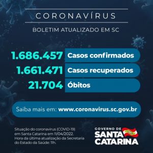 Há, em Santa Catarina, 1.686.457 pacientes com teste positivo para Covid-19, sendo que 1.661.471 se recuperaram e 3.282 estão em acompanhamento. O dado foi divulgado nesta segunda-feira, 11. Desde o início da pandemia, 21.704 óbitos foram causados pelo corona vírus. A taxa de letalidade atual é de 1,29%. Em comparação