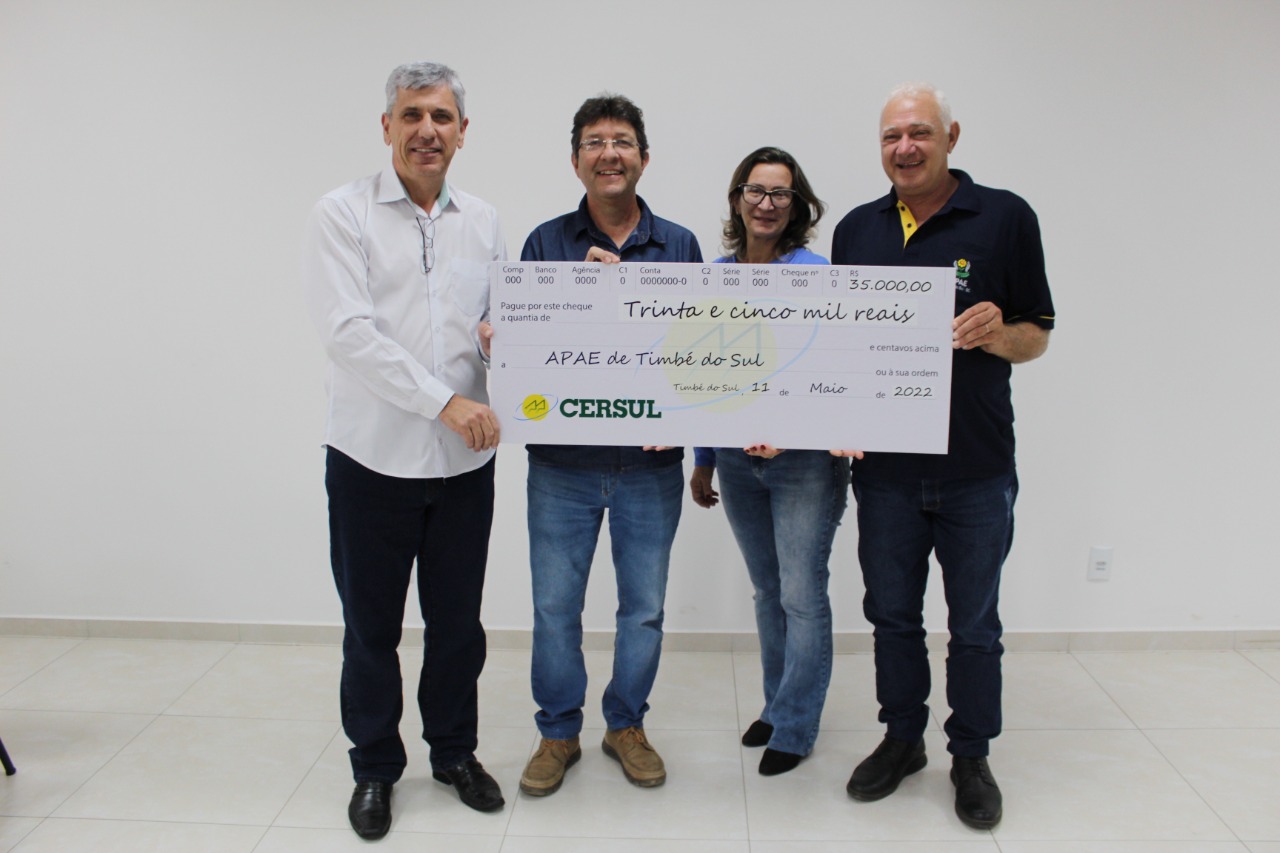 A Cooperativa de Eletrificação Rural Sul Catarinense (Cersul) está destinando R$ 35 mil para cada uma das Apaes de municípios que atende. As associações de Maracajá, Meleiro, Timbé do Sul e Turvo já receberam a doação.