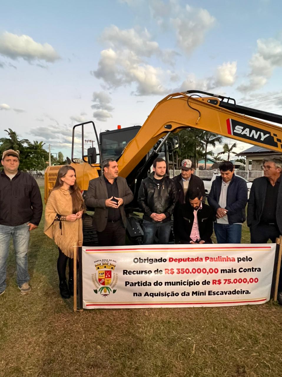 A deputada estadual Paulinha (Podemos) passou por Santa Rosa do Sul e levou ao prefeito Almides da Rosa (PSDB) uma emenda para uma mini escavadeira de R$ 350 mil, com contrapartida de R$ 75 mil de recursos municipais.