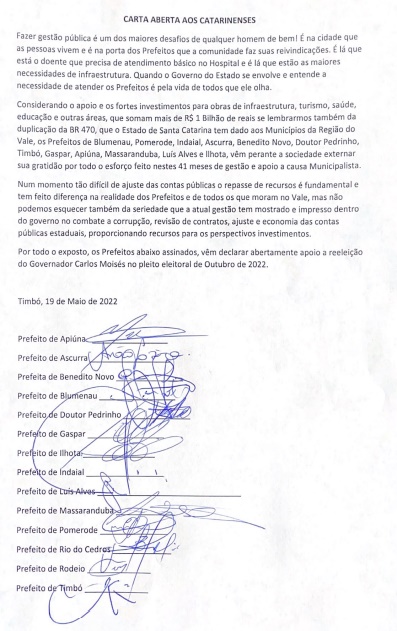 Em Timbó e Ascurra, Carlos Moisés da Silva (Republicanos) fez repasse de recursos, mas foi em Indaial que houve apoio de um grupo de 14 prefeitos da Região do Vale. Além do prefeito de Blumenau, Mário Hildebrandt (Podemos), que já é aliado do governador, assinaram uma carta aberta os prefeitos de Apiúna, Ascurra, Benedito Novo, Doutor Pedrinho, Gaspar, Ilhota, Indaial, Luiz Alves, Massaranduba, Pomerode, Rio do Cedros, Rodeio e Timbó.