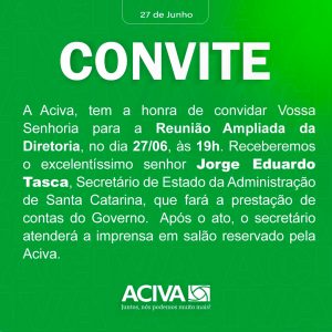 A Associação Empresarial do Vale do Araranguá (Aciva) tem a honra de convidar você para a sua Reunião Ampliada da Diretoria, no dia 27/06, às 19h. Na ocasião receberemos o excelentíssimo senhor Jorge Eduardo Tasca, secretário de estado da Administração de Santa Catarina, que fará a prestação de contas do