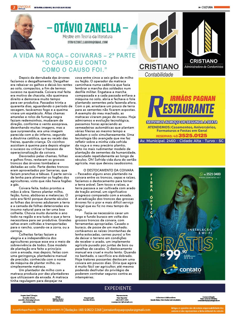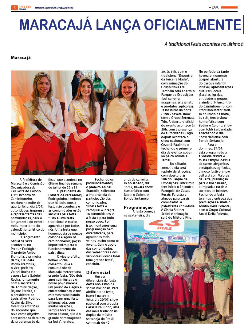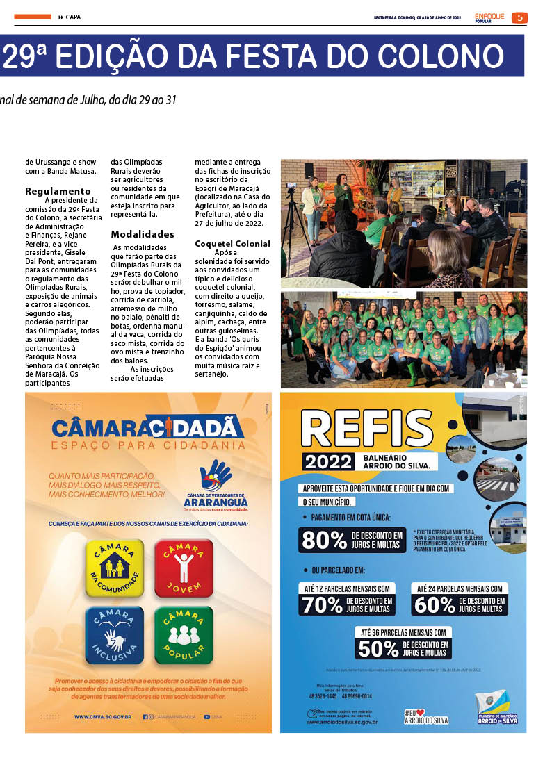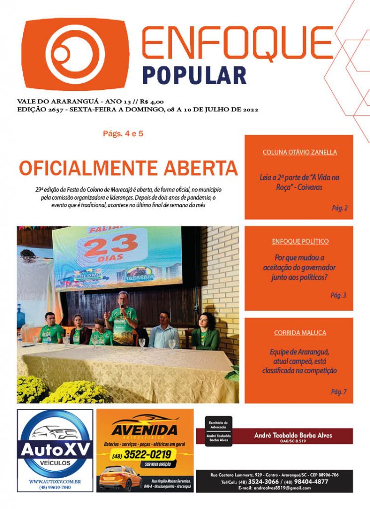 Edição 2657 – 08 a 10 de Julho de 2022 – Jornal Enfoque Popular – capa Festa do Colono