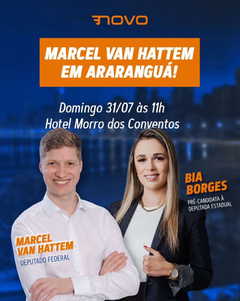 Nesse domingo (31), 11 horas, a candidata a deputada estadual por Araranguá, Bia Borges (Novo) faz evento no Hotel do Morro com a presença do deputado federal Marcel Van Hatten (Novo/RS). Trata-se de um dos participantes mais destacados do Congresso Nacional.