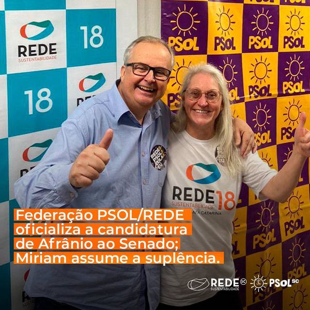 Neste sábado (30), também foi realizada a convenção da Federação PSOL/REDE, em Santa Catarina, que oficializou a candidatura de Afrânio Boppé (PSOL) ao Senado e o Miriam, ambientalista e filiada à Rede Sustentabilidade, assume a primeira suplência.