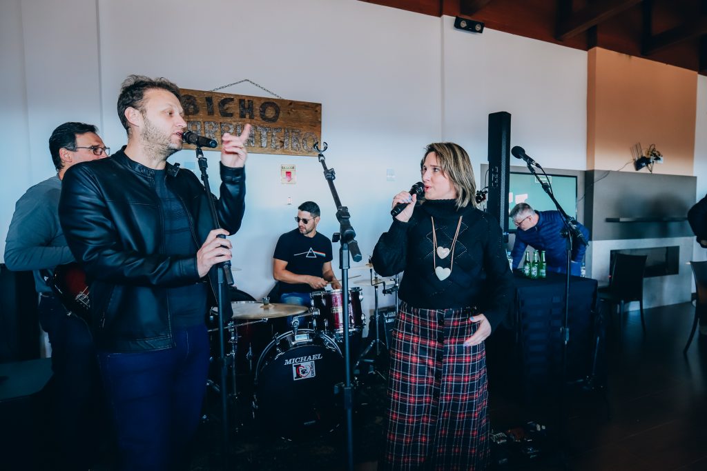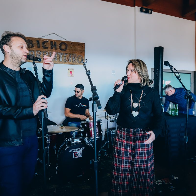 Também compartilharam suas trajetórias os empresários/músicos Fernando Weber e Murilo G. Schneider. Fernando trouxe a história de 36 anos da Weber Cidades Inteligentes e o recente posicionamento da empresa em construir empreendimentos com as verticais de educação, inovação/empreendedorismo e bem-estar. Já Murilo, co-CEO da Procer Agrointeligência em Pós-Colheita, falou sobre como a agritech de Criciúma chegou ao patamar das mais relevantes do segmento de soluções para automação e monitoramento de silos. Depois das falas, Fernando assumiu os microfones e a faceta frontman da banda Bicho Carpinteiro e agitou o evento, com Murilo revelando o talento de baixista em algumas canções. A empreendedora Janelise Royer dos Santos, da Expresso São Miguel, de Lages, e o escritor best-seller de mercado imobiliário Marcus Araújo também soltaram a voz em algumas canções.