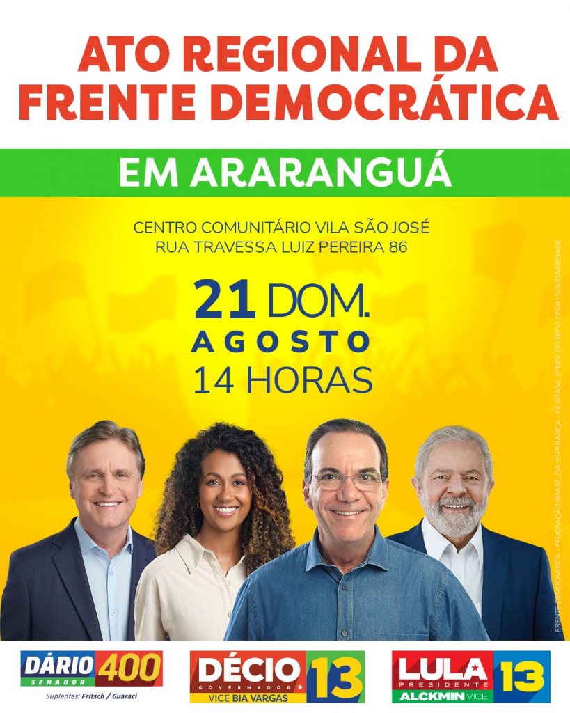 O Partido do Trabalhadores (PT) fará evento domingo (21), às 15 horas, no Salão Comunitário de Vila São José, que deve ter a presença da chapa majoritária: Décio Lima (PT) a governador; Bia Vargas (PSB) a vice; Dário Berger (PSB) a senador; o suplente José Fritsch (PT).