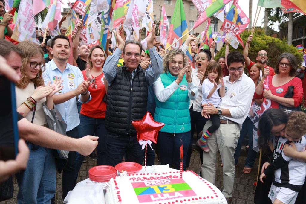O candidato da Frente Democrática (PT, PSB, PCdoB, PV e Solidariedade) ao governo de Santa Catarina, Décio Lima, participou de ato neste sábado (1) em Blumenau, onde foi prefeito por dois mandatos. Ele também cortou um bolo em comemoração ao seu aniversário.