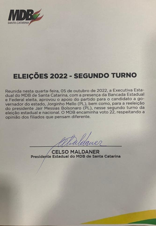 Reunida nesta quarta-feira, 05 de outubro de 2022, a Executiva Estadual do MDB de Santa Catarina, com a presença da Bancada Estadual e Federal eleita, aprovou o apoio do partido para o candidato a governador do estado, Jorginho Mello (PL), e à reeleição do presidente Jair Messias Bolsonaro (PL), nesse segundo turno da eleição estadual e nacional.