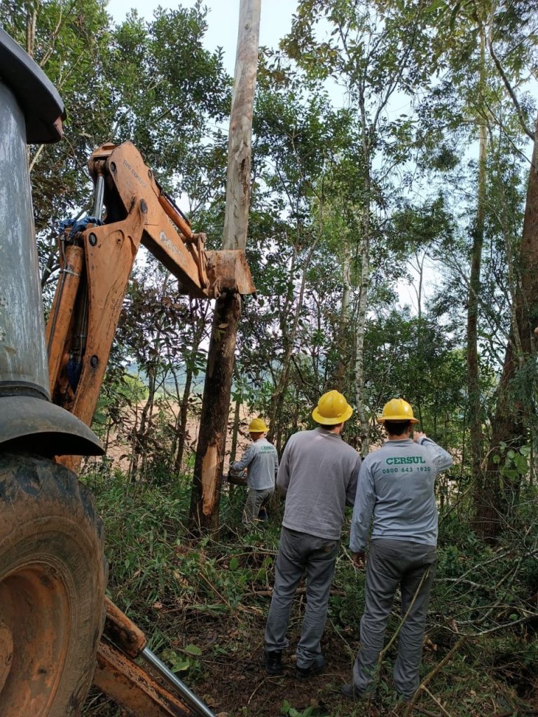 A equipe de Limpeza de Rede da CERSUL (Cooperativa de Distribuição de Energia) atuou nesta segunda-feira (27) na comunidade de São Peregrino, em Turvo, às margens da rodovia SC 108. O trabalhou contou com retroescavadeira para auxiliar na demanda.