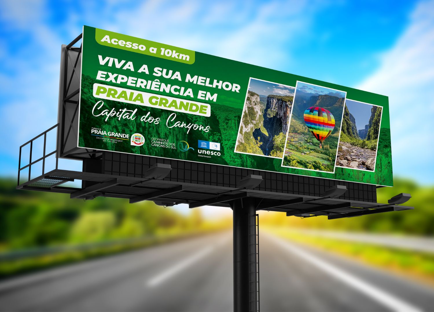 Com a frase retratada no outdoor também será destacado as marcas da prefeitura de Praia Grande e secretaria de Turismo, Geoparque Caminhos dos Cânions do Sul e Unesco (Organização das Nações Unidas para Educação, a Ciência e a Cultura), do qual é integrante.