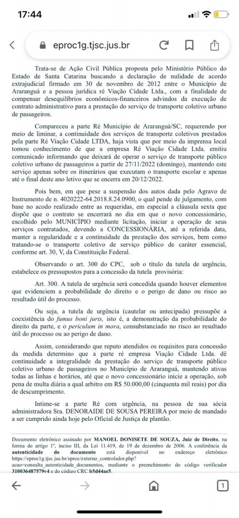 Pela decisão, a Viação Cidade, de Araranguá, que é a concessionária prestadora do serviço de transporte coletivo no município, é obrigada pela justiça a manter a prestação regular do transporte público de passageiros sob pena de multa diária de R$ 50 mil pelo descumprimento.