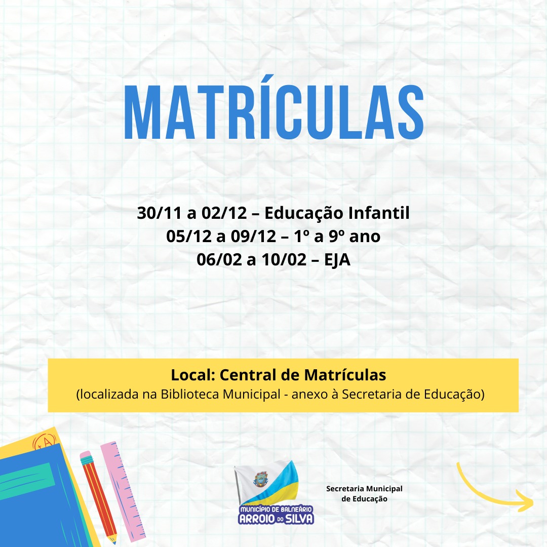 Pais e responsáveis devem ficar atentos ao período de matrícula escolar da rede municipal de Balneário Arroio do Silva. Já foram realizadas as rematrículas e agora inicia o período de matrículas novas. A partir de hoje até sexta-feira as matrículas serão para o ensino infantil; na próxima semana é para o 1º ao 9º ano. Já a EJA, o período de matrículas novas é em fevereiro. Lembrando que todo processo de matrícula é realizado na Central de Matrículas, localizada na Biblioteca Municipal, localizada anexo à Secretaria de Educação. Acompanhe o cronograma: