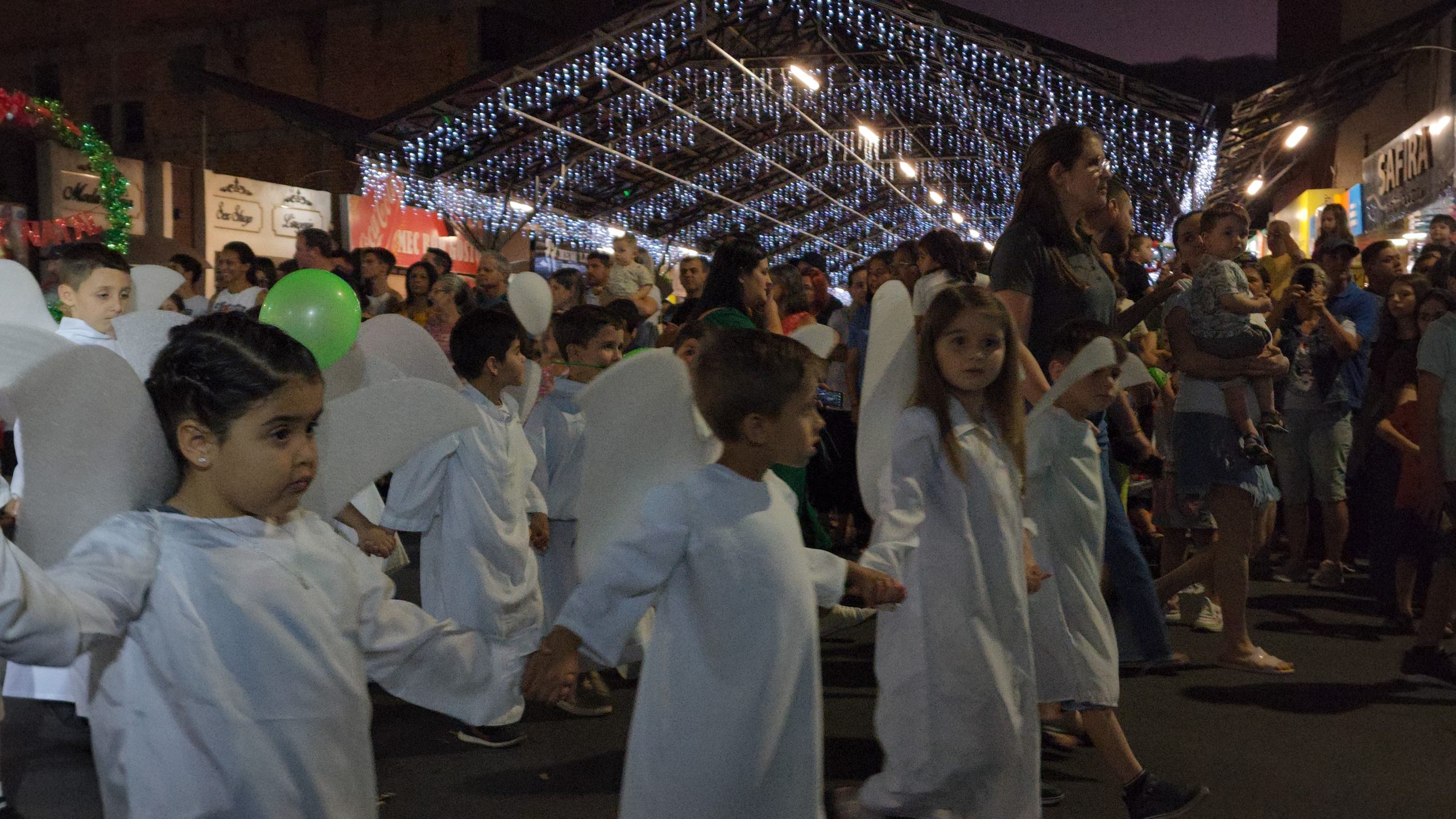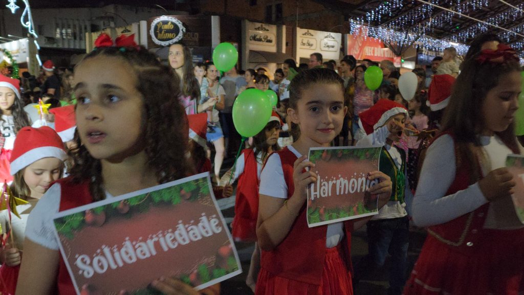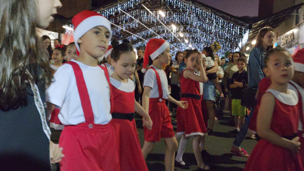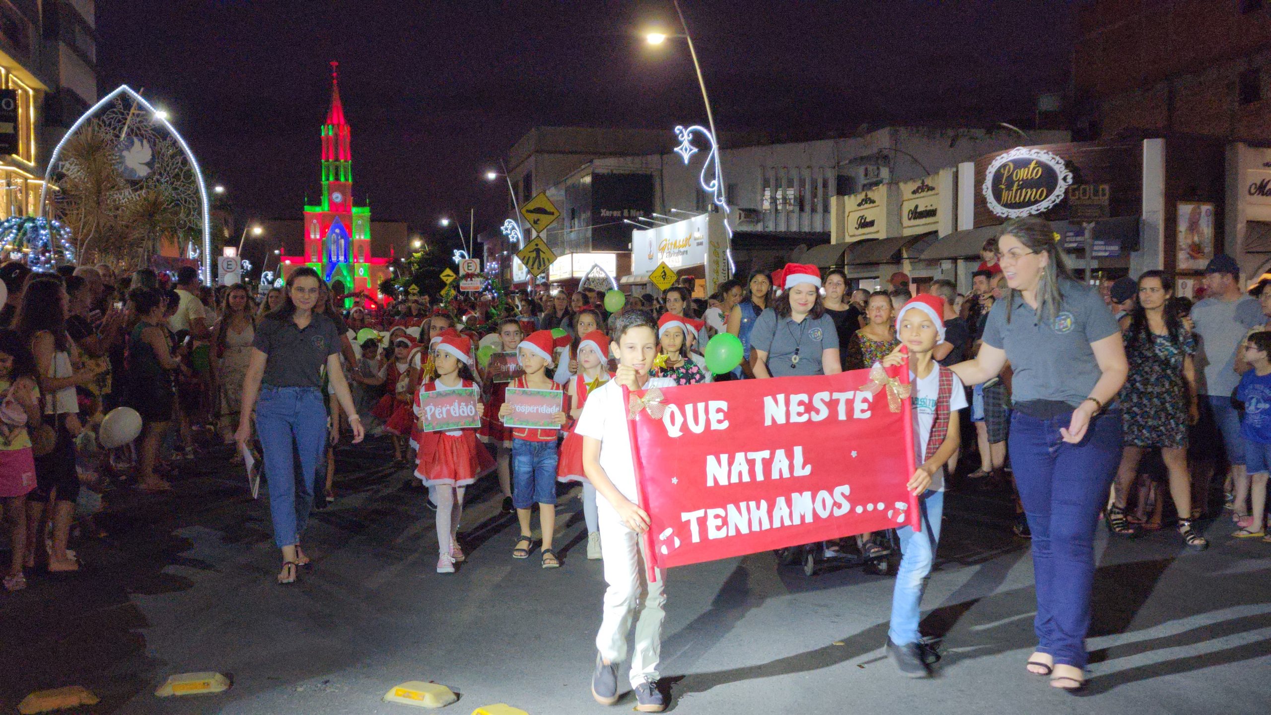 Escolas e CEIs, municipais, filantrópicos, estaduais e particulares e projetos da Casa da Cultura participaram do evento realizado na Avenida Getúlio Vargas, no Centro, onde a decoração também feita pelas escolas e creches dá o tom das festividades de fim de ano.