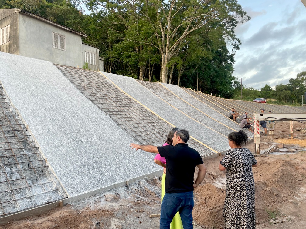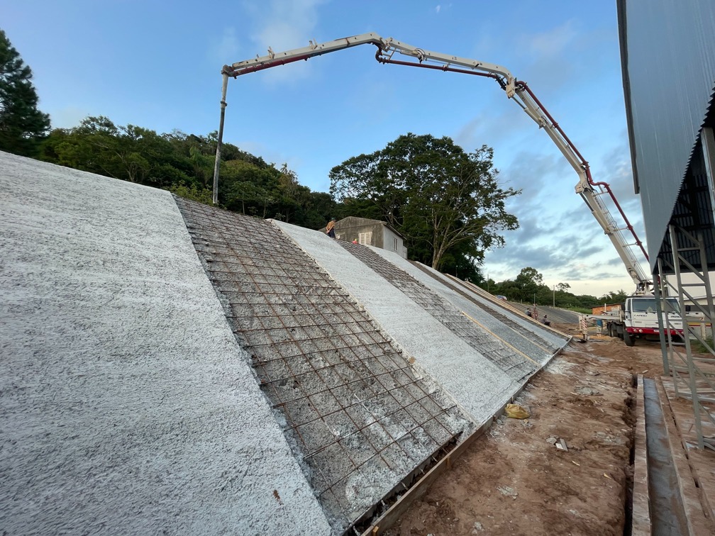 Está entrando em fase final a construção de um talude de concreto armado na comunidade de Jaguarari, em Santa Rosa do Sul. O objetivo da obra é evitar possíveis deslizamentos de terra em uma área de morro em que estão localizadas uma escola de ensino fundamental e a igreja locais.