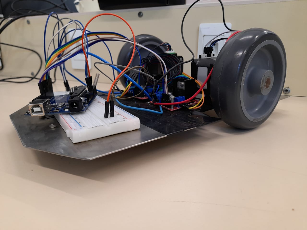 Um dos projetos foi a construção e a automação de um sistema de navegação, isto é, um robô sobre rodas, utilizando a plataforma de controle Arduino. A exemplo dos equipamentos utilizados pelos estudantes em competições de robótica, o robô é movido a motores e possui sensores de distância e de proximidade, além da capacidade de percorrer trajetos de forma autônoma, a partir de programação prévia.