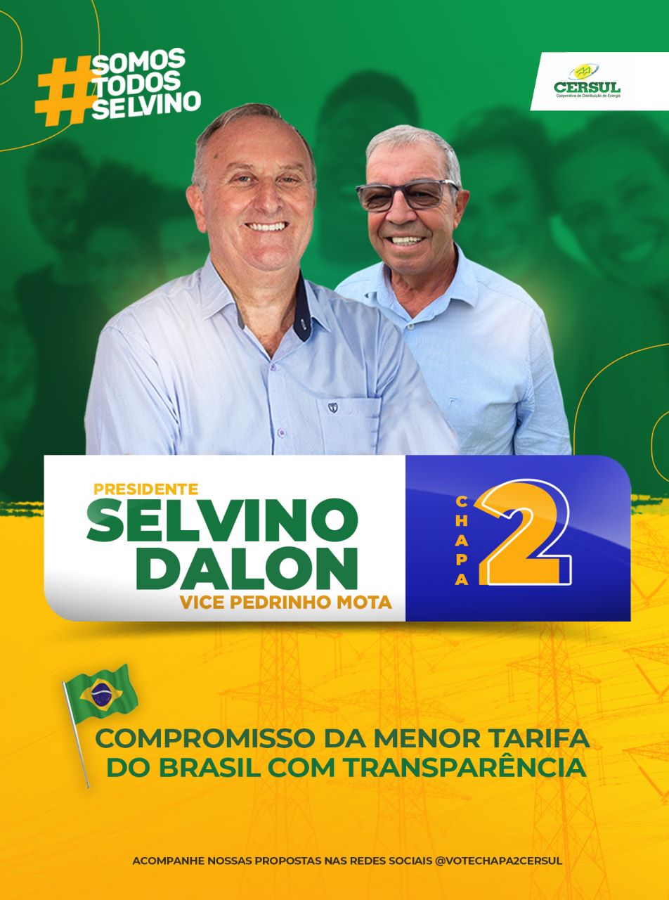 Nas redes sociais da @chapa02cersul, será possível conhecer o que se chamou de “Compromisso de eficiência com o associado” em que elenca suas propostas para a gestão da cooperativa. Para a campanha os apoiadores deverão adotar a #somostodosselvino.