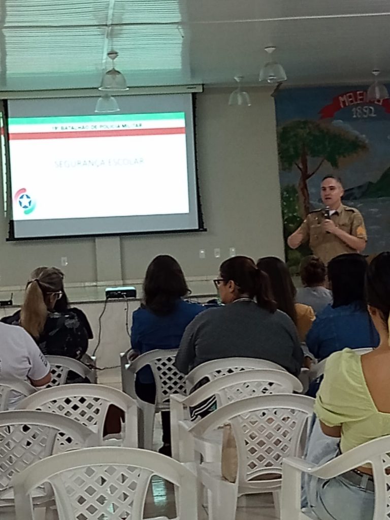 Segurança Escolar e Prevenção ao Abuso Sexual Infantil na Rede de Educação, o Comandante do Grupamento de Polícia Militar de Meleiro, Sargento Cristiano Guizzo e Cabo Jaqueline, realizaram na última quarta-feira, 26 de abril, palestras para os diretores, gestores e professores das redes municipal e estadual de ensino de Meleiro. O evento contou com a presença da secretária de Ação Social, Elixsandra Mota, secretária de Educação, Cultura, Esporte e Turismo, Erica Merêncio Pagnan Nazário, Assistente Social e Presidente do Conselho dos Direitos da Criança e do Adolescente, CMDCA, Rosineia Manoel Borges e Conselheiros Tutelares do Município.