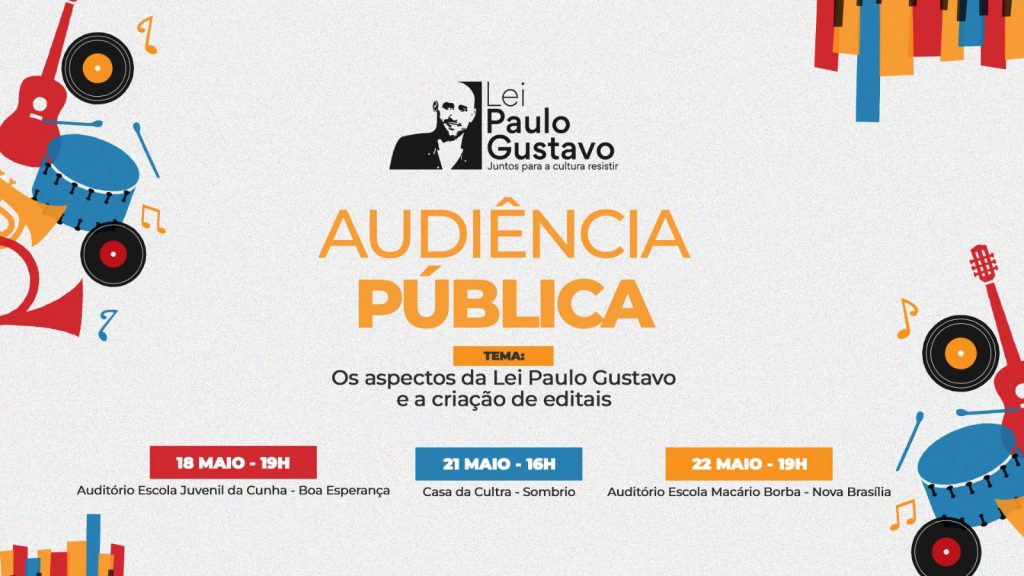 O Conselho Municipal de Cultura de Sombrio, setor público e sociedade civil, convidam a população em geral e, em especial, os fazedores de cultura, artistas de diversas linguagens, para as audiências públicas sobre a aplicação dos recursos da Lei Paulo Gustavo.
