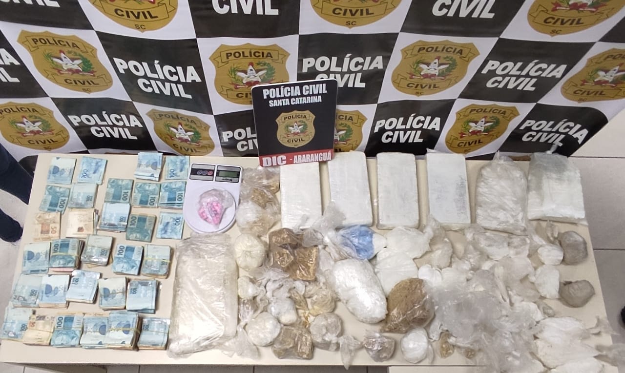 A Divisão de Investigação Criminal (DIC) de Araranguá, após três meses de investigação, prendeu nesta tarde (22), um homem de 21 anos e realizou a apreensão de mais de 8 kg de cocaína, mais de dois quilos de crack, 75 comprimidos de ecstasy e mais de 46 mil reais em dinheiro.