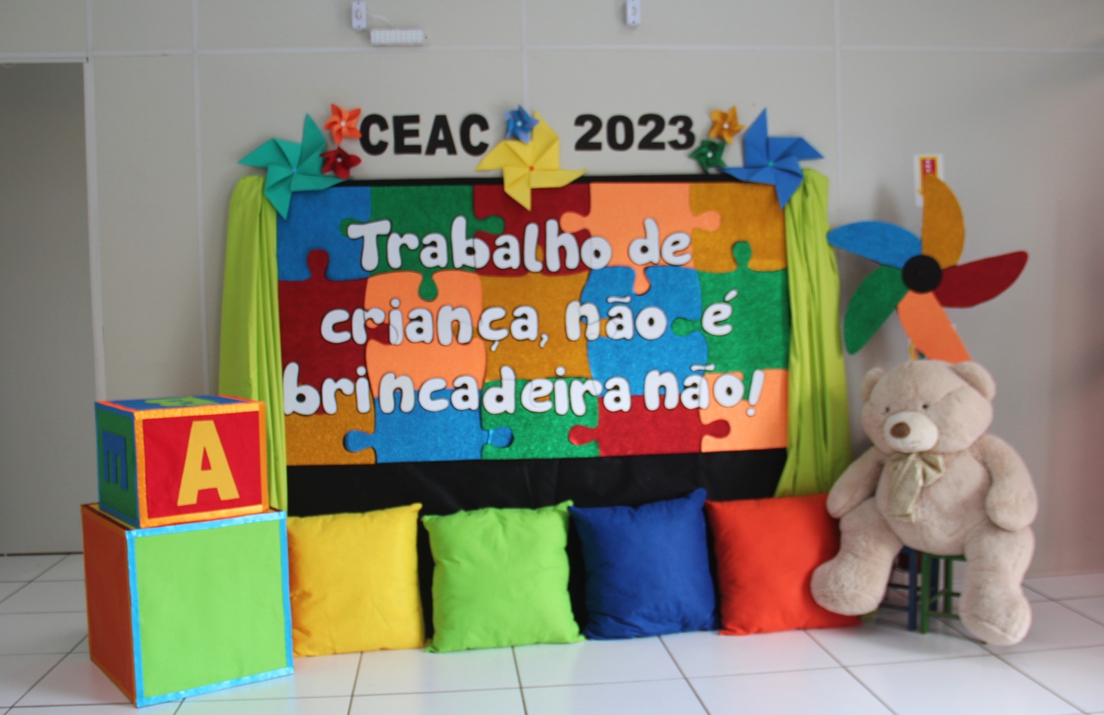 A agenda de atividades contou com três dias de eventos, iniciando na segunda-feira, 12, com a abertura e uma roda de conversa lúdica com as crianças do CEAC, para a sensibilização sobre o tema. Na quarta-feira foi a vez de assistir ao vídeo com a contação de histórias, sobre o combate ao trabalho infantil e de confeccionar cataventos de cinco pontas, o símbolo da campanha em todo o mundo.