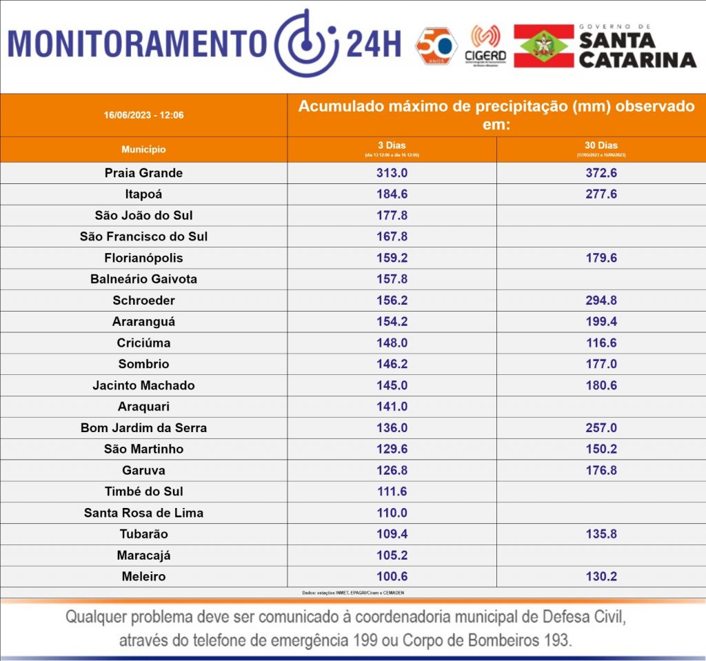 “Normalmente, junho é um mês que chove pouco no litoral. Para termos uma ideia, pro Litoral Norte fica em torno de 80mm a 100 mm por mês, já no Litoral Sul entre 120 mm e 140 mm por mês”, explicou Caio Guerra, Meteorologista da Defesa Civil de Santa Catarina.