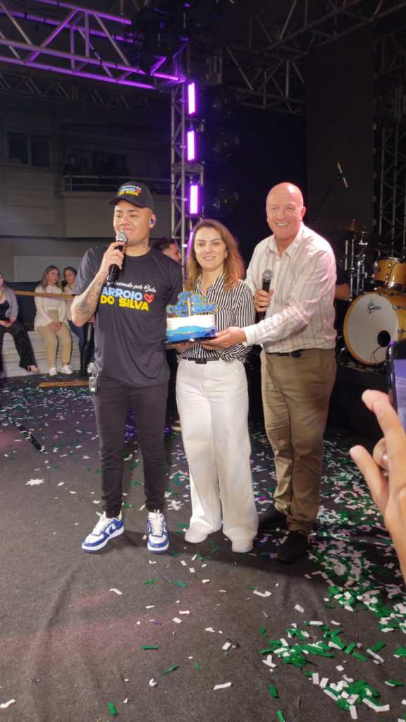 O cantor estava de aniversário neste domingo e a comemoração teve direito à “parabéns pra você”. O prefeito Evandro Scaini e a primeira-dama Diane Scaini subiram ao palco com bolo de aniversário e um presente personalizado para que Felipe Araújo lembre sempre com carinho do município.