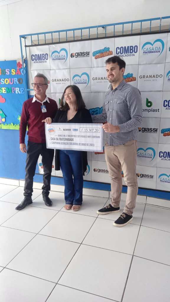 Foi com muita alegria que a presidente da Casa da Fraternidade recebeu os representantes da empresa Bomplast, Tiago Fernandes e do Combo Atacadista, o gerente Rodrigo Souza para a entrega do cheque simbolico no valor de R$ 15.307,20 referente a venda de 21.260 pacotes de Saco de Lixo Versatil da empresa Bomplast nas lojas Giassi e Combo Atacadista em prol da instituição no mês de maio. Um resultado muito bom dentro das espectativas.