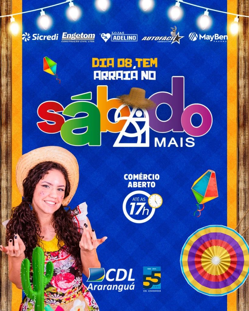 Quem gosta de lojas abertas no sábado num ambiente que convida às festas de julho não pode perder o Sábado Mais no Arraiá, quando o comércio estará de portas abertas até às 17h para comemorar junto com os clientes o dia festivo.