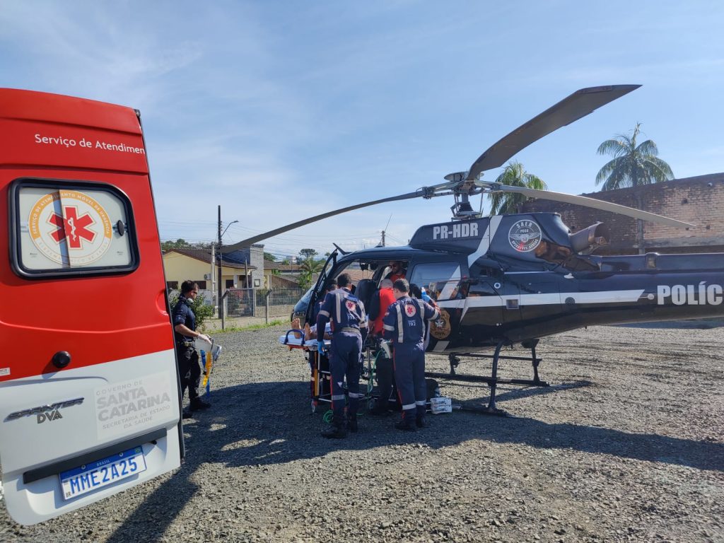 No final desta manhã, por volta das 11h40, a central do SAMU acionou para transferência do município de Praia Grande para Criciúma, um homem de 53 anos, vítima de acidente de trabalho, com Traumatismo Crânio Encefálico (TCE) grave, com fratura de crânio, após cair de aproximadamente 3 metros. Foi atendido e intubado no hospital Nossa Senhora de Fátima, de Praia Grande. O paciente foi transferido para o hospital São José para avaliação neurológica e tratamento definitivo.