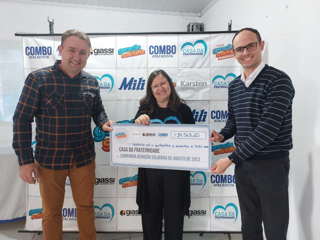 A Campanha gerou uma arrecadação total de R$ 14.563,20 no mês de Agosto, valor que foi repassado através de um cheque simbólico pelas mãos de Giovani Alexandre Turatti, representante da Rede Giassi Supermercados e do Combo Atacadista, e de Etmar Karls, gerente de vendas da Karsten, que veio de Blumenau para prestigiar o evento.