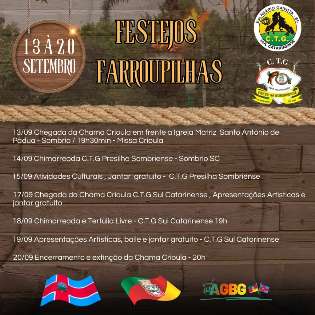 As atividades dos Festejos Farroupilhas irmanam os municípios de Sombrio e Balneário Gaivota, com apoio da Associação dos Gaúchos de Balneário Gaivota, AGBG. A comissão organizadora convida a todos os interessados e simpatizantes da cultura tradicionalista para participar das atividades nos dois municípios, mais precisamente nos CTGs Presilha Sombriense, de Sombrio e Sul Catarinense, de Balneário Gaivota.