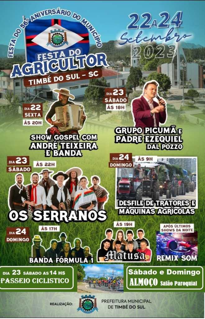 O município de Timbé do Sul se prepara para mais uma edição da tradicional da festa realizada na Praça Central. Neste ano é comemorado o 56º aniversário do município e também a Festa do Agricultor.