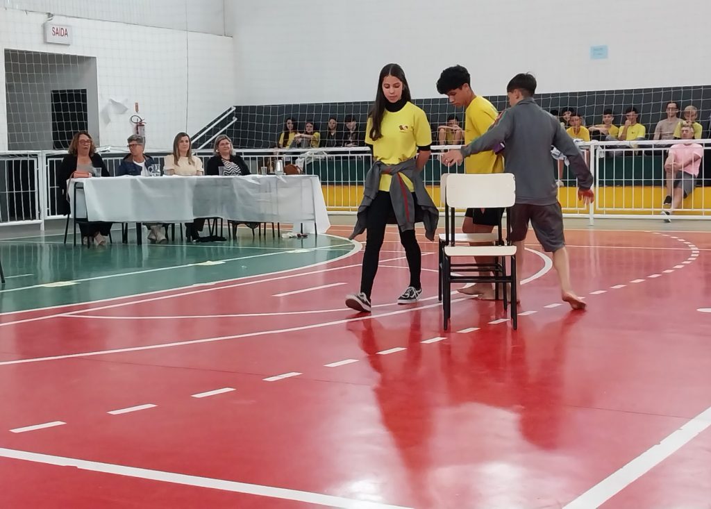Cinquentamos Alda! O coro com alunos do sexto ao nono ano ecoava no ginásio de esportes em mais uma etapa da gincana que foi realizada nesta terça-feira, 20. Com a presença de ex-professoras na banca de juradas, a etapa começou com a competição dos cartazes, passando pela prova dos calçados trocados até a tradicional dança das cadeiras.