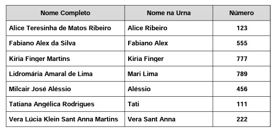 Confira os nomes e números dos candidatos (dados completos na imagem):
