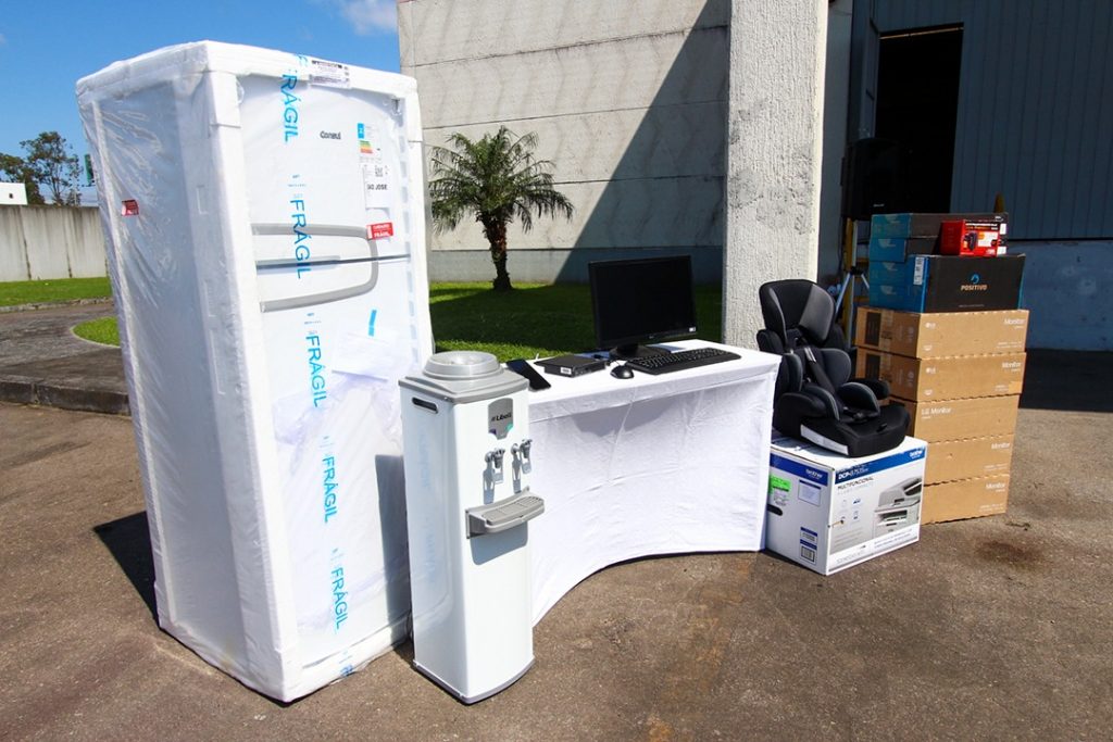 Cada kit é composto por cinco computadores e monitores, uma impressora multifuncional, um bebedouro, um refrigerador, um smartphone e uma cadeira para transporte de crianças em automóveis.