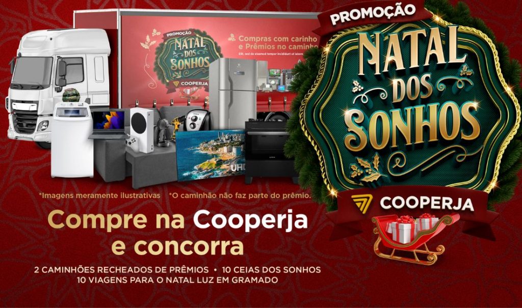E a Rede de varejo, incluindo Supermercados, Lojas agropecuárias e Posto de combustíveis da Cooperja iniciou hoje, segunda-feira (9) a nova Campanha, denominada Natal dos Sonhos. Serão dois caminhões recheados de prêmios, além de 10 ceias dos sonhos e 10 viagens para ver de perto o Natal luz de Gramado.