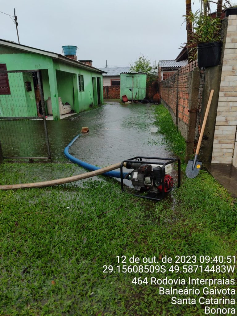 Um recurso que vem sendo muito empregado pela Defesa Civil de Balneário Gaivota para retirar o excesso de água dos pátios de moradores das comunidades mais afetadas pela chuvarada tem sido a bomba hidráulica.