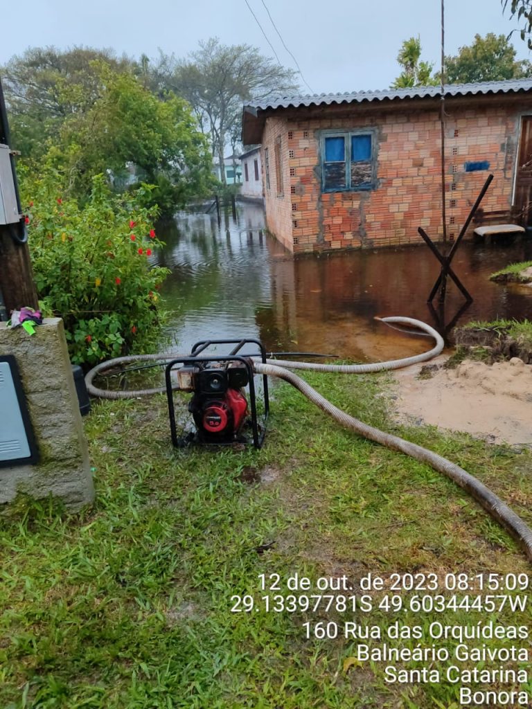 Um recurso que vem sendo muito empregado pela Defesa Civil de Balneário Gaivota para retirar o excesso de água dos pátios de moradores das comunidades mais afetadas pela chuvarada tem sido a bomba hidráulica.