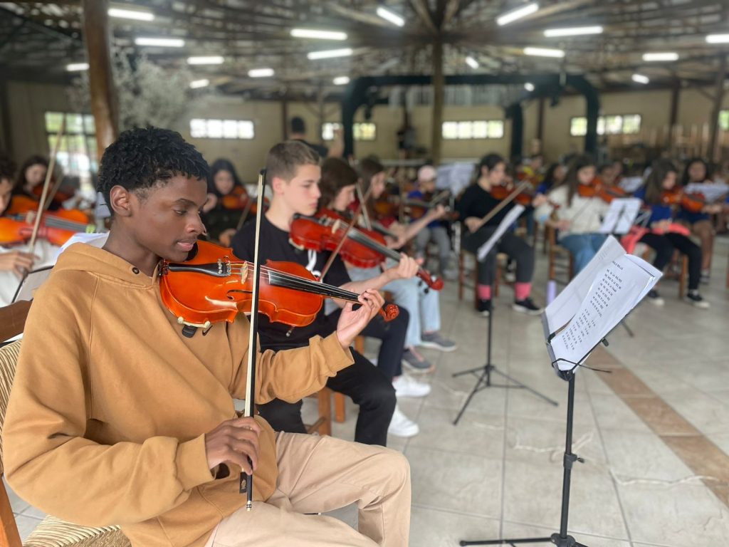 Evelin Patrício de Souza, uma estudante de 10 anos da Escola Municipal de Educação Básica Albino Zanatta em Jacinto Machado, estava animada com o dia de estudos. Além de ser violinista, ela também aprecia o maculelê, revelando sua paixão pela música e sua vontade de explorar novos lugares. Através da Orquestra, Evelin conseguiu unir suas duas paixões.