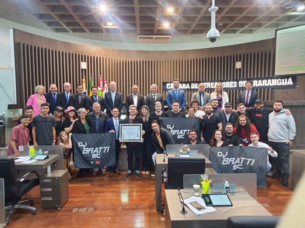 “Guilherme Bratti Inácio nasceu no dia 28 de maio de 2000, em Araranguá/SC. Filho de Marco Antônio Maciel Inácio, conhecido como Guinho e de Claudia Andrea Bratti Inácio, também residentes de Araranguá. Na escola, era um aluno dedicado e tirava notas boas, tinha muitos amigos o que já trazia um certo destaque para ele. Os amigos na escola chamavam pelo sobrenome Bratti, e nem imaginavam que logo mais todos o chamariam assim. Bratti cresceu, formou no ensino médio, cursou Gestão Pública e trabalhou por um período na prefeitura. Além disso, ajudava seus pais nas lojas do Camelódromo. Como quase todo jovem, adorava festas e sair com os amigos. E foi assim que um talento foi descoberto, através de uma brincadeira. Seus amigos do grupo Atura ou Surta, também gostavam da bagunça, e um deles chamado Alex Miguel possuía um reboque de som, assim o Bratti começou a se interessar pela música, pois pelo fato de sempre estar escutando mega funk e atualizado do que está bombando no momento, seus amigos sempre pediam para gravar pendrive para as festas, até que no ano de 2020 eles deram a ideia dele começar a fazer também esse tipo de música e lançar no Youtube, onde despertou um certo interesse, lançando em Julho do mesmo ano o primeiro mega, na brincadeira que deu certo, sem saber ainda que iria tocar em tantas baladas, já que na época estava tudo fechado. Seu pai, Guinho, comprou uma mesa de som (controladora), das mais simples para incentivar o filho a investir nessa área. Infelizmente só viu uma de tantas apresentações que seu filho já fez, que foi no Primos em Criciúma. A pandemia do COVID estava complicada na época e, junto de milhares de perdas, Guinho acabou falecendo em abril de 2021, não podendo presenciar o sucesso que o filho teria tempo depois. Em meio a dor e a tristeza, Bratti juntou forças para continuar lutando. Com o apoio da família e amigos percebeu que não estava sozinho naquele momento. E agora, além das pessoas próximas também conta com o apoio de fãs e colegas de trabalho. Bratti continuou a realizar seus shows cerca de 3 meses depois do falecimento de seu pai, quando viu que estava preparado, e foi um sucesso! Desse momento em diante, tocou em diversas casas noturnas e com públicos cada vez maiores, de acordo com a melhora da pandemia. Bratti então estudou maneiras de divulgar seu produto e buscava investir em materiais melhores, trazendo novidades e brindes para os fãs. Sua fama foi crescendo e começou a fazer shows fora do estado de Santa Catarina, como RS e Paraná, levando sempre a cultura alegre dos araranguaenses por onde passava, contando ainda com 2 amigos e funcionários, Gabriel e Lucas que trabalham em sua produção. Devido à grande proporção que seu trabalho tomou, Guilherme soma mais de 45 mil inscritos no seu canal do YouTube. Lá, posta vídeos com suas novas músicas, as quais ultrapassam o número estrondoso de seis milhões de visualizações. E hoje, seu esforço e dedicação o trouxeram até aqui, para ganhar a Menção Honrosa de Reconhecimento por serviços prestados à cultura do jovem araranguaense”.