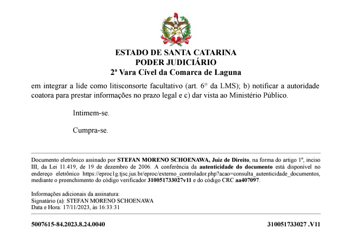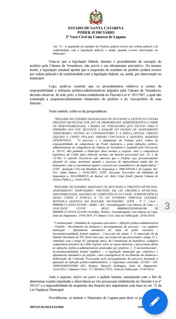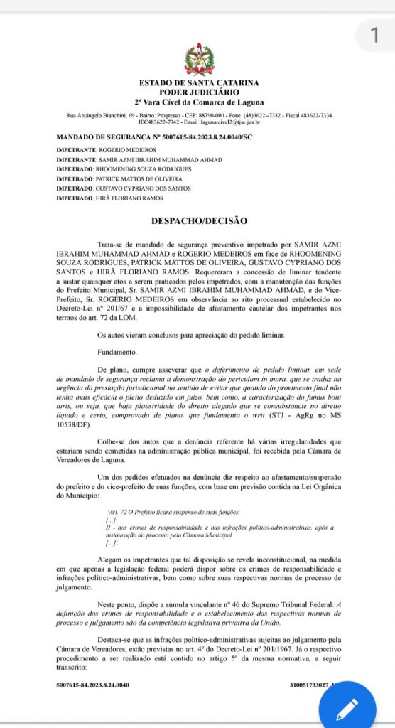 Nesta sexta-feira, 17, o juiz Stefan Schoenawa, da Justiça de Laguna, concedeu liminar em um processo de mandado de segurança impetrado pelo prefeito Samir Ahmad (sem partido) e do vice Rogério Medeiros (PSD), de Laguna.