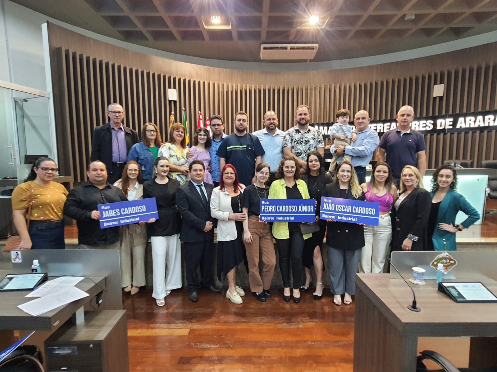 Com a aprovação do projeto, a Rua A4 passa a ser denominada “Pedro Cardoso Júnior”, a Rua A5 recebe o nome de “Adílio Costa”, a Rua A7 é agora “Jabes Cardoso”, a Rua A8 foi designada como “João Oscar Cardoso”, e a Rua A9 leva o nome de “José Silva”. A emoção tomou conta dos familiares dos saudosos araranguaenses que foram homenageados, ao receberem do vereador as placas indicativas.