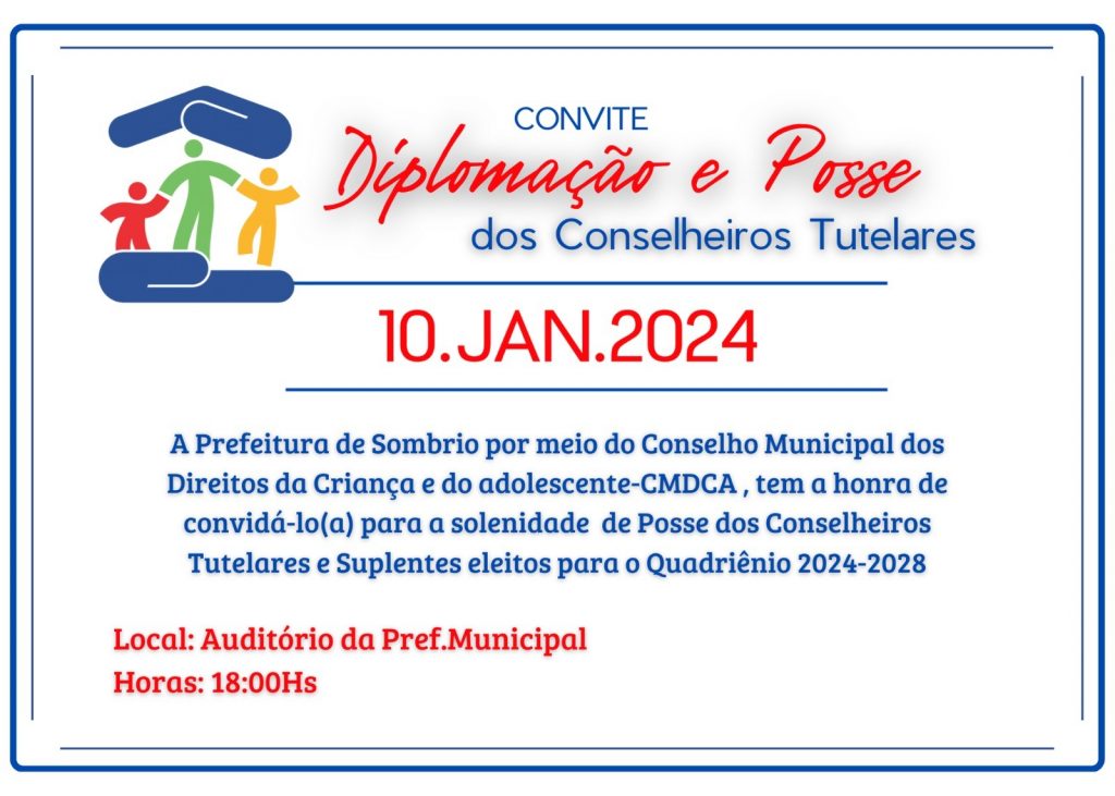 A Prefeitura Municipal de Sombrio, por meio do Conselho Municipal dos Direitos da Criança e do Adolescente – CMDCA, anuncia a cerimônia de posse dos Conselheiros Tutelares e Suplentes eleitos no ano de 2023.