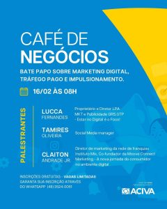 Com o intuito de fomentar o networking e oferecer conhecimento aos empresários da região, a ACIVA (Associação Empresarial de Araranguá e do Extremo Sul Catarinense) organizará no dia 16 de fevereiro, sexta-feira, às 08 horas, um Café de Negócios com foco em Marketing Digital, Tráfego Pago e Impulsionamento. O evento